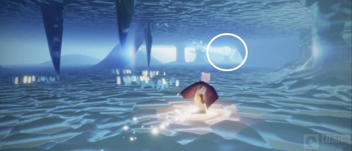 2、然后回遇境,进入霞谷地图,顺着滑道来到霞谷的溜冰场,水之灵就在溜冰场内,是蓝色的光球。