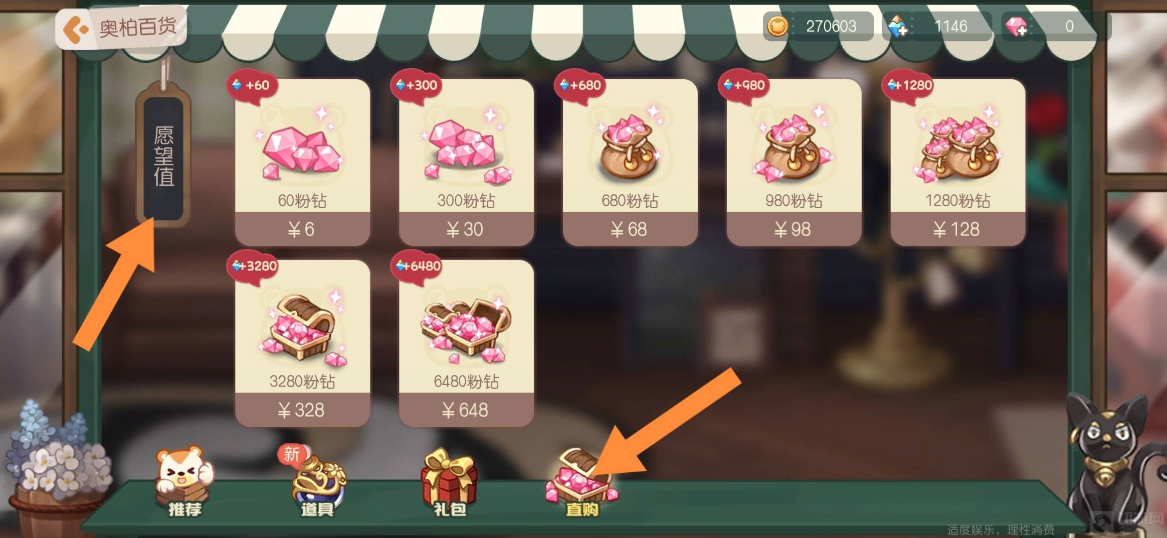 2. 然后点击直购,可以在左侧找到愿望值,点击即可查询。