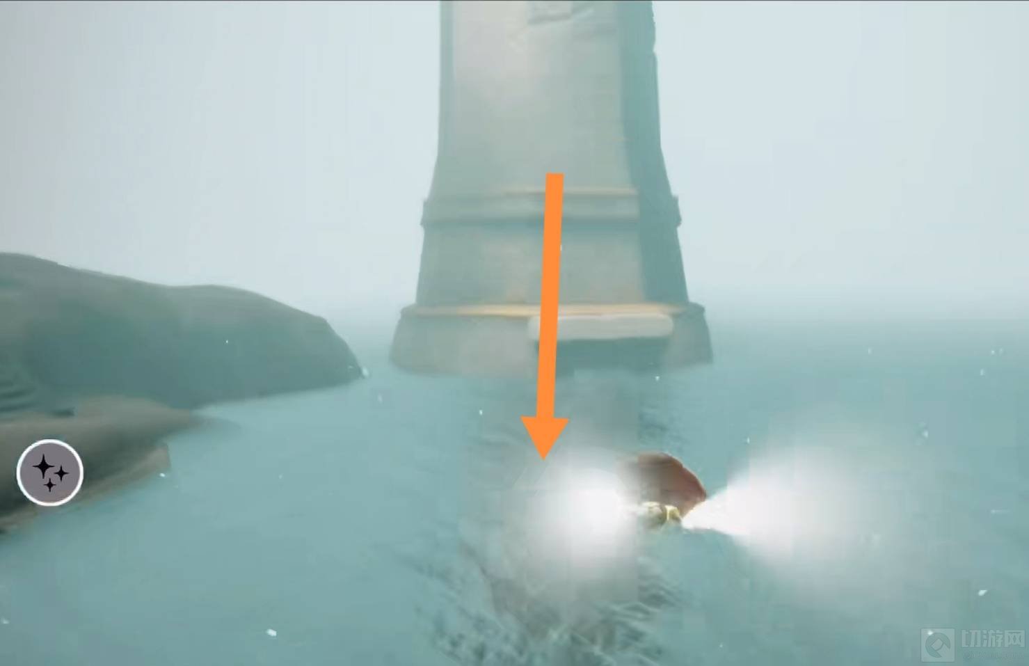 1、在向导先祖处领取完第四个任务后,根据地图上的指示,飞到海面上最高的塔附近,潜入水中。