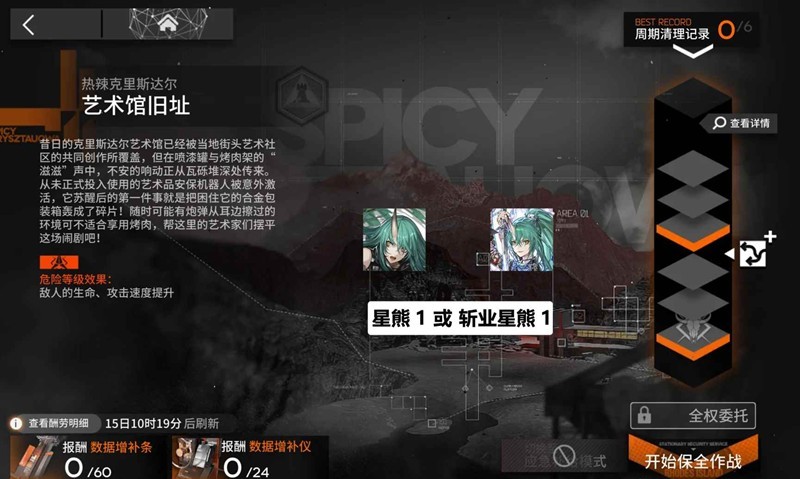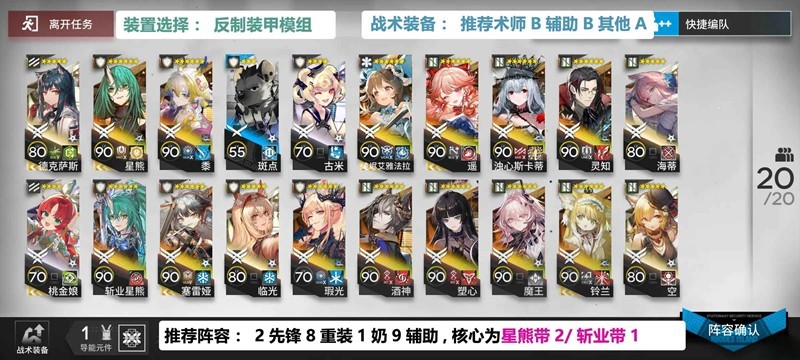 核心:采用星熊2或者斩业星熊1(都不用专精),装置推荐选[反制装甲模组],阵容为2先锋8重装1奶9辅助,重装推荐多带奶盾,辅助推荐优先带塑心/酒神/遥/浊蒂,选干员可以拿重装/少量医疗做任务。以下关卡有双星熊可优先双星熊。
