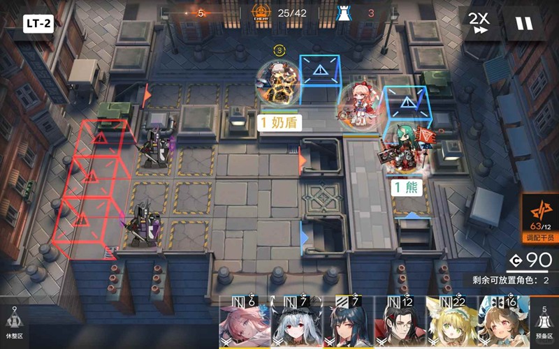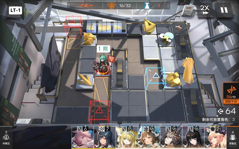 第六关:开局可以先摆先锋回费,蓝门下放奶盾,右边放星熊(优先叠右边),高台补个奶/遥即可。