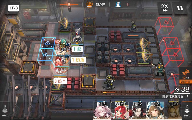 第二关:两个蓝门叠两个重装即可,上面奶盾下面星熊,可以中间加奶或辅助,叠的慢可下投锋。