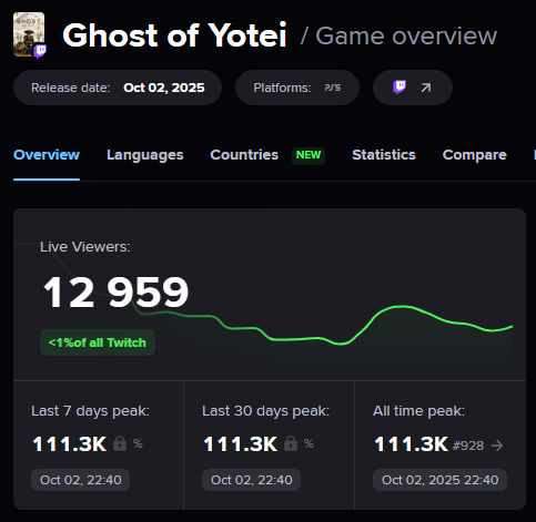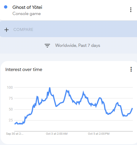 根据数据,《羊蹄山之魂》在Twitch上的观看人数在短短5天内从峰值的11.1万人暴跌到不到1.3万人,而谷歌的趋势数据显示,即使在周末,热度也持续下滑——这对游戏来说是最糟糕的情况。