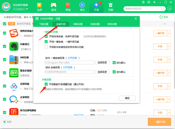 3、然后找到下方"升级设置"一栏中的"开启智能升级提醒功能",将其小方框勾选上,并点击下方中的"确定"保存即可。