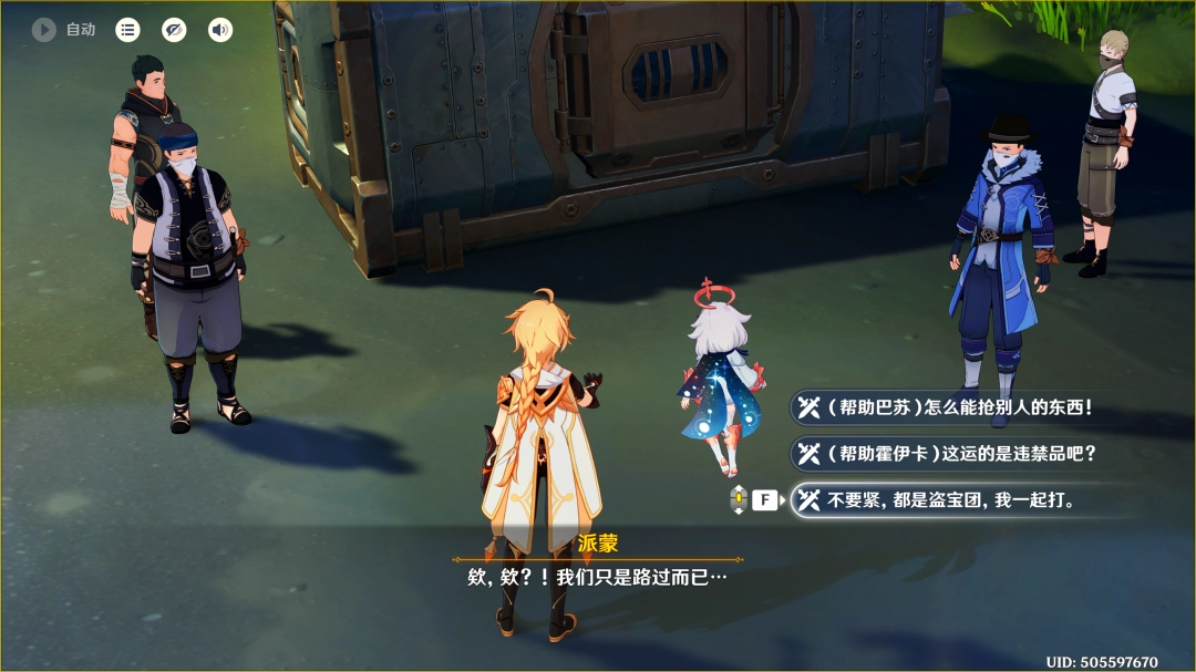 来到此处后,我们靠近与他们对话,即可触发剧情(又是和「识者之证」有关)