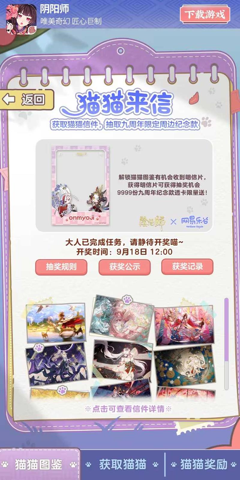 阴阳师寻喵纪周年庆H5活动的开奖时间为9月18日12:00,届时将公布获奖名单。玩家需要在开奖前完成所有任务,以确保能够参与抽奖。这个时间点对于所有参与活动的玩家来说都非常重要,因为它决定了谁能获得九周年纪念款透卡等限量奖励。