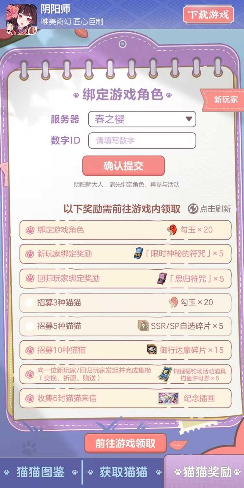 参与阴阳师寻喵纪周年庆H5活动,首先需要绑定游戏角色。绑定成功后,可以获得勾玉、限时神秘的符咒等奖励。同时,通过招募猫猫,可以获得更多奖励,如SSR/SP自选碎片、御行达摩碎片等。此外,邀请好友绑定游戏角色,也能获得未收录式神猫猫奖励。