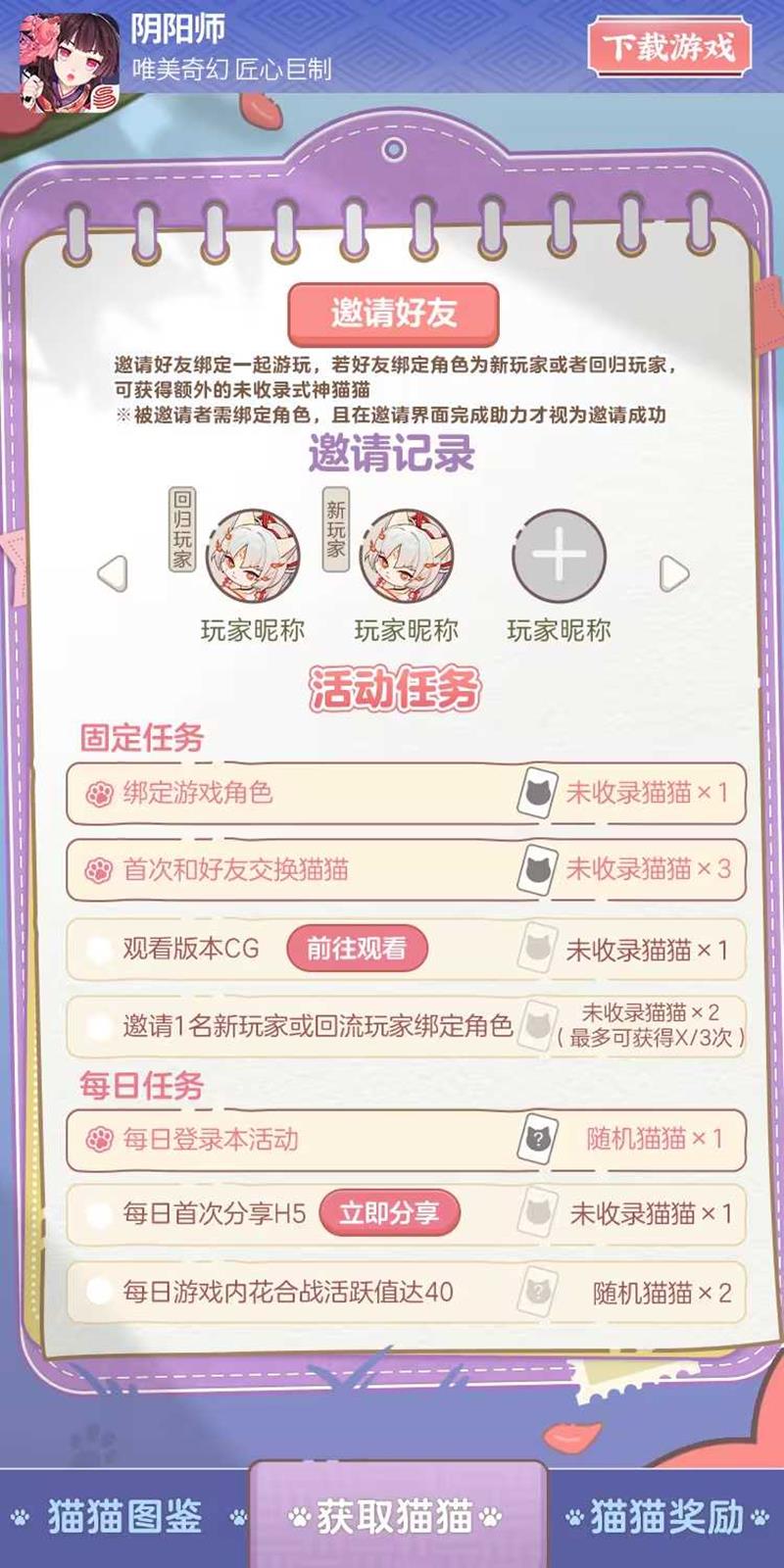活动还设有每日任务,如每日登录、分享H5、游戏内花合战活跃值达40等,完成这些任务可以获得随机猫猫奖励。这些任务不仅增加了游戏的趣味性,也为玩家提供了更多的奖励机会。