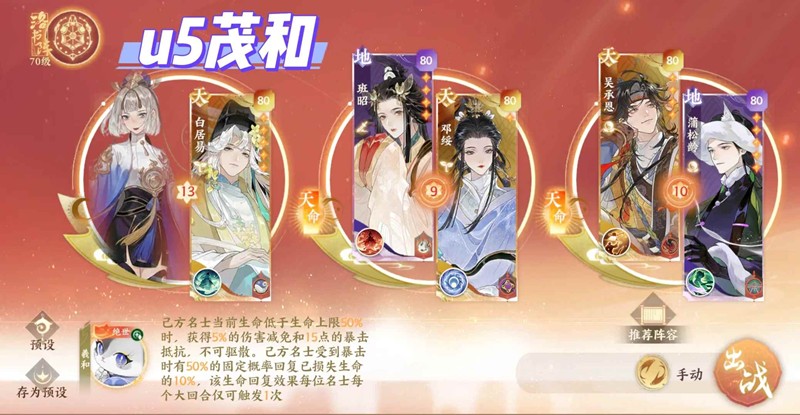 茂和不是特别难过,我的茂和套是0级,邓绥起到一个衣架的作用,配队还试了双白吴蒲班/昭绥吴蒲冯,都可以过,先点掉杨玉环白居易和boss。