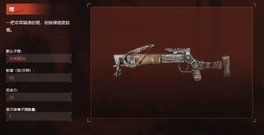 要说最基础的远程武器,那必然就是弩箭了,弩箭本身的获取方式足够简单,并且他的射击精准度极其的高,在夜间希望对敌方进行偷袭的时候,弩箭可以完美做到一击必杀,毫无声息地将敌方的哨兵解决掉,还不会对周围的其他敌人造成惊扰,特别适合在暗中行动做暗杀这一类的活动,在对局中,弩箭也是大多数玩家们所选择使用的刺杀武器,不过这个武器的缺点很明显,换弹速度很慢。