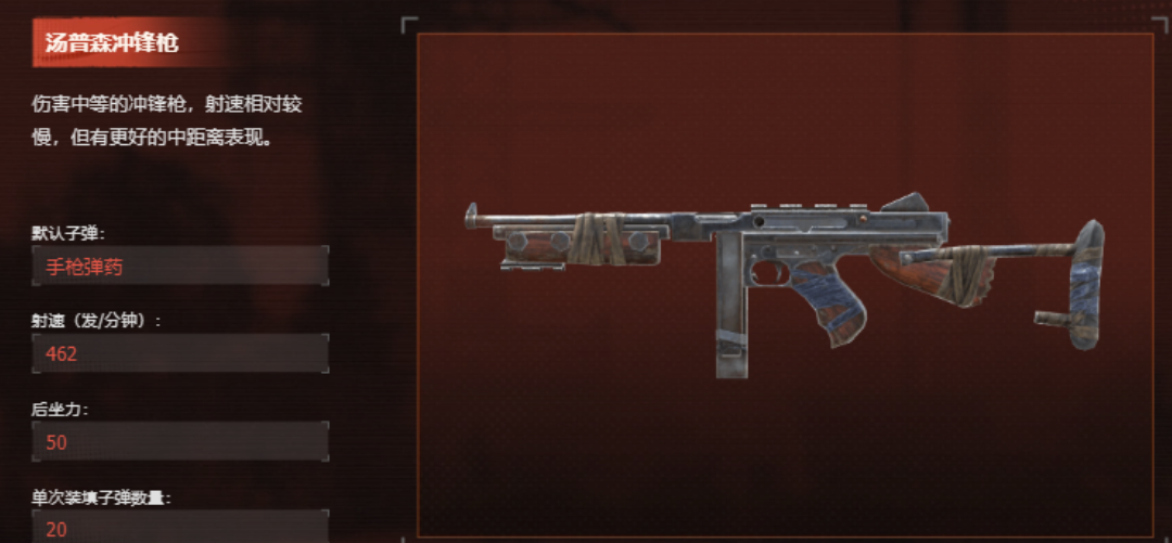 汤姆逊冲锋枪是一个属于伤害中等的冲锋枪,在中近距离的时候,他可以发挥出极好的战场优势,并且冲锋枪还有着比较高的射速,它可以在敌人悄悄靠近时,快速进行射杀能够,直接对对面的火力进行压制,所以在中等这个距离进行冲突的时候,汤姆逊冲锋枪可以给玩家们迅速带来战斗节奏,他的单次子弹数量也适中,刚好有20发,当距离合适的时候,冲锋枪会给玩家们带来更多惊喜。