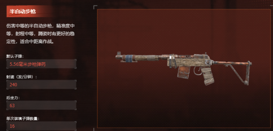 远程武器当然不会少了步枪的身影,步枪是一个非常适合打伏击战的,半自动步枪则是很不错的一把步枪,他的精准度以及在使用时的稳定性都是很不错的,后坐力也并不高,使用起来非常轻松,他的射程可以达到足足250m,对对手的踪迹可以轻松狙击,而且在使用半自动步枪时,玩家们还可以继续搭配红点瞄准镜或者是消音器一类这样可以使他的对局表现更加优秀,迅速将远处的敌人清除产生拦截效果,分配玩家清理远程的敌人增加的瞄准镜则可以大大提高命中率,是一个非常不错的中距离武器,注意在使用这个武器时使用蹲姿可以更好的进行输出。