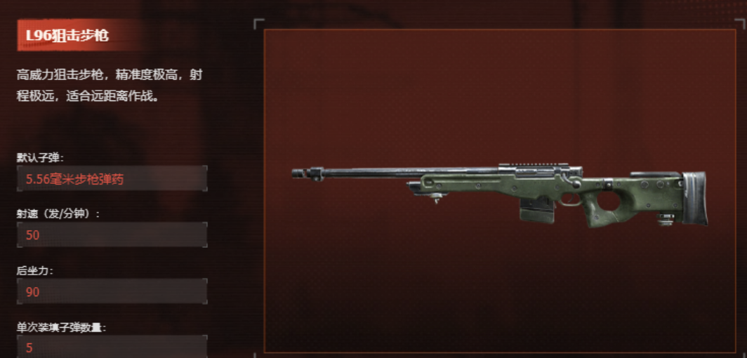 而所有武器中步枪自然也拥有着远距离的步枪这一类型,L96狙击步枪就属于可以远程输出的步枪,之所以能够远距离输出是因为它本身的规格达到了军用级别,整个武器精准度也是相当之高,但是他单次中能够装的子弹非常少,只有5颗,它的作用主要就是靠伏击敌人,在敌人还在远距离进行靠近的时候,玩家们就可以使用这个武器进行拦截。