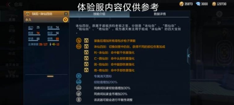 9A91-诛仙四剑除了拥有装备后增加所有背包步枪子弹数的常规技能外,其最独特之处就在于这条名为“诛仙四剑”的技能:切换剑匣中的剑,获得不同的部位伤害加成。此技能切换不同的仙剑对应不同的效果,下面一一介绍,大家注意看技能切换和伤害变化。