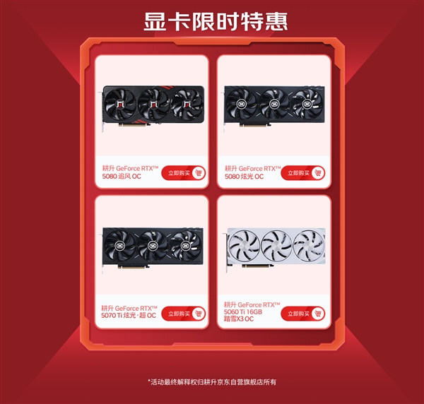 本次耕升双11年终钜惠活动,更是一场为不同需求的用户量身打造的显卡焕新契机!如果你已经看好了心仪的型号,不妨现在就去耕升京东自营旗舰店确认细则,及时下单锁定福利!若还在犹豫,也可以趁活动时间充裕,对比不同型号的性能参数与优惠力度,希望耕升 GeForce RTX 50系列显卡,能陪大家度过一段又一段的难忘时光!