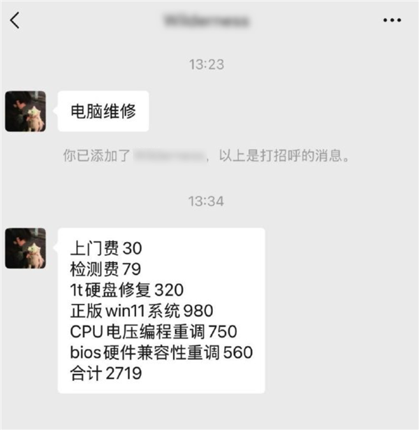 有网友找师傅上门修个电脑,最后居然掏了 2719 元?