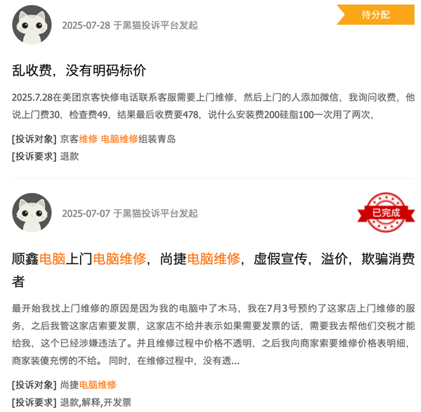 黑猫投诉上,跟电脑维修相关的投诉超过 3000 条,其中很多都是因为乱收费。