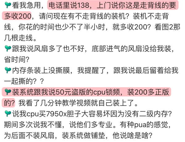 还有网友在电话里说好 138 装机,上门就变成“走背线加 200”。