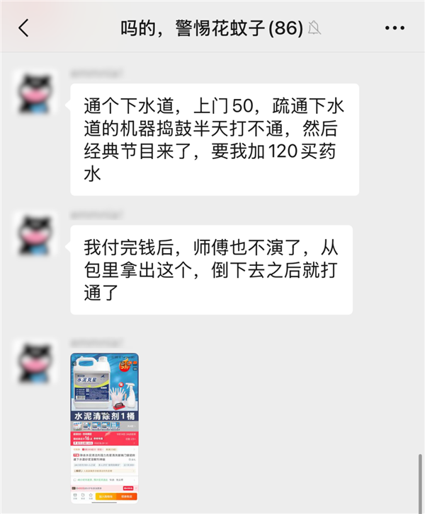 编辑部同事家里下水道堵了,师傅第一次没通开,说要用特殊药水,接着张嘴就是 120 元。
