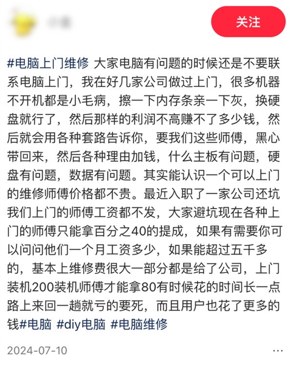 小红书上有一位做过上门维修的网友,也爆料过行业内幕。