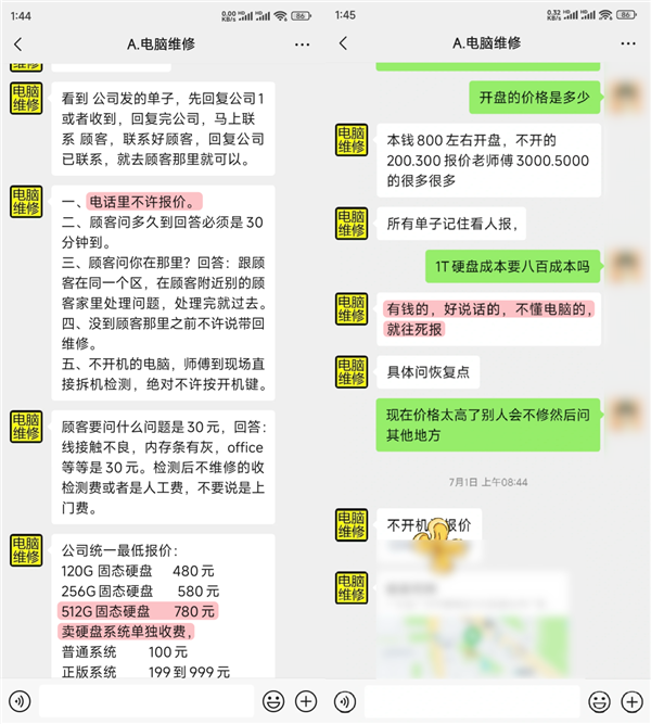 所有单子都要加收 50-300 元的人工费,固态硬盘的报价更是离谱——120G 报 480 元,256G 报 580 元,512G 要 780 元,而这些硬盘的成本价也就一两百块钱。