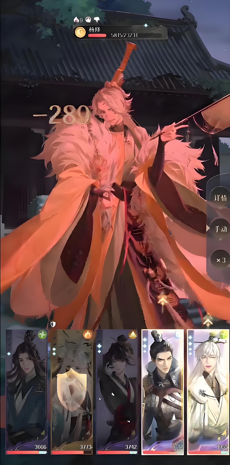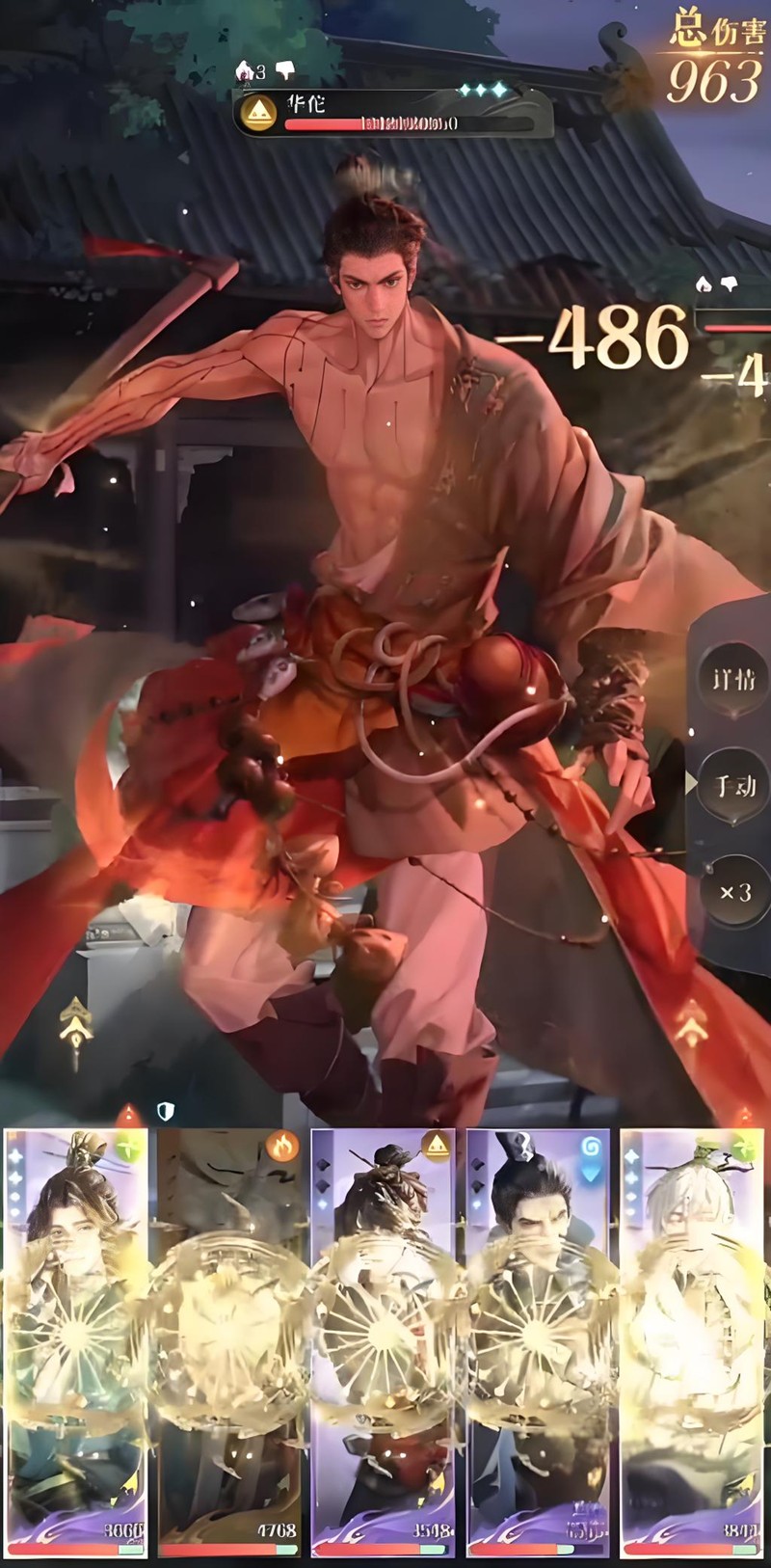 第四回合颜良发动攻击时可能会承受杨修的单体大招,导致血量大幅下降。这时史子眇需要及时释放大招为颜良回复生命值。郭解同时开大提供护盾,陈登则配合为队友回复能量。第五到六回合继续锁定华佗进行普通攻击。