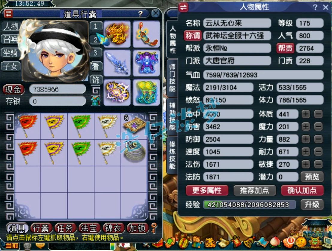 175级大唐打符之后的面板属性,他选择的是血耐加点,在拥有12693气血的同时,还有3462的伤害,防御达到了2504,抗性十足。