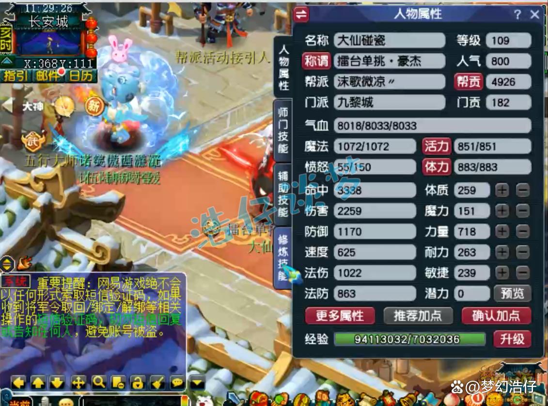 号是109级的九黎城,这是没打临时符的面板属性,打符之后伤害能达到2500左右,属性还是非常不错的。从他的称谓可以看出来,他还是非常喜欢打单挑的。