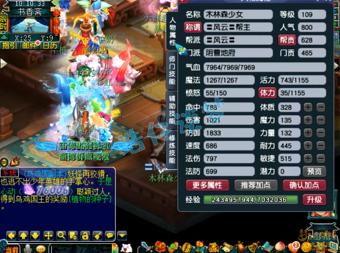 109级地府没打临时符的面板属性,打符之后能有2000多的防御,气血能达到9000多,属性还是非常不错的。