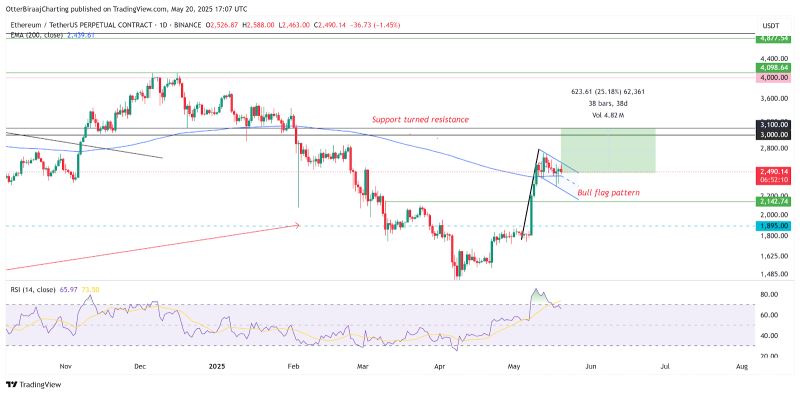 在比特币冲击历史高位的同时,以太坊的技术形态也呈现出突破迹象。日线图上,ETH在2,400至2,750美元区间构筑的看涨旗形已接近尾声,该形态目标位指向3,000-3,100美元阻力带。