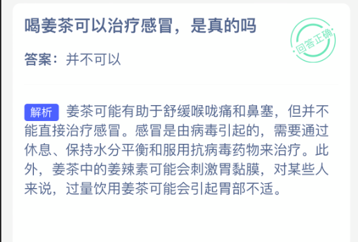 姜茶可能有助于舒缓喉咙痛和鼻塞,但并不能直接治疗感冒。感冒是由病毒引起的,需要通过休息、保持水分平衡和服用抗病毒药物来治疗。此外,姜茶中的姜辣素可能会刺激胃黏膜,对某些人来说,过量饮用姜茶可能会引起胃部不适。