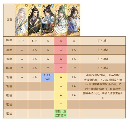 安期刘豹非必须,看自己练度按需上场,最好一个单体伤害+一个群攻+董奉孔融+曹植