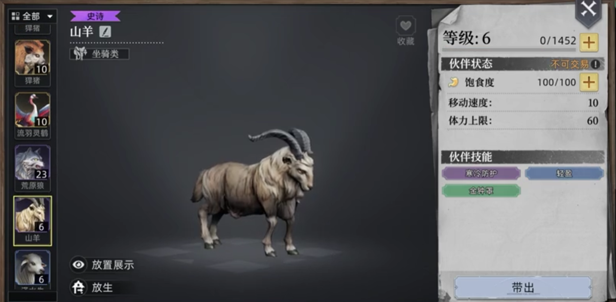 还有就是比较出色的山羊,山羊本身的助益是为玩家们增加获取石头的速度,在凿石这一方面是比较出色的,也同样是和野猪一样是对物资的进行获取,石头一般在游戏中获取的需求量较大,并且在制作工具的时候都需要石头,所以山羊也是一个不错的宠物,但获取山羊必须要前往雪山,获取有一定的难度,除去雪山本身的危机寒冷天气以外,还有需要篝火将冰封山羊的冰块进行融化,雪原附近本身拥有大量的危险生物,小编更推荐小伙伴们一同前行。