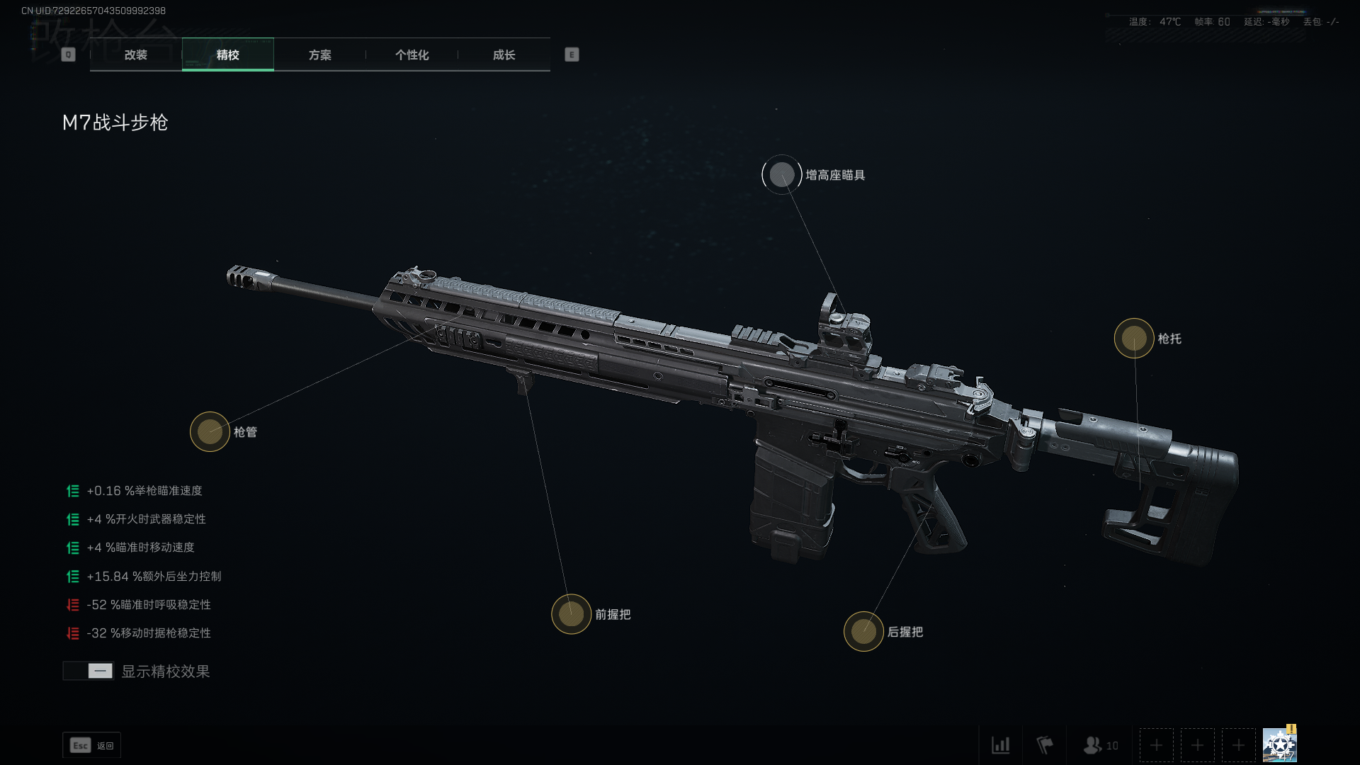 最后精校方案如图,主要可以获得4%开火时武器稳定性以及15.84%额外后坐力控制,凭借着精校我们可以让M7在远距离也能获得不错的命中率。