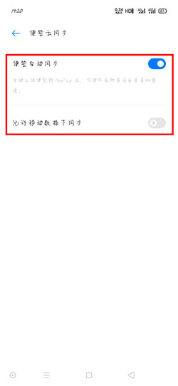 2、进入便签云同步后,将【便签自动同步】功能开启,这样手机在WiFi状态下,每修改一次便签,自动同步一次,如果当前没有WiFi,可以开启【允许移动数据下同步】,使用流量同步便签;