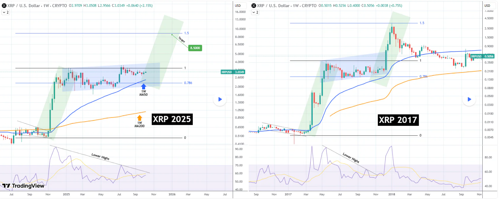 根据 TradingShot 在 TradingView 上的最新文章,XRP 当前的价格走势与 2017 年末的走势惊人地相似——当时该代币从 0.50 美元飙升至 3.65 美元,创下历史新高。分析师认为,同样的形态现在可能会在周线图上再次出现。
