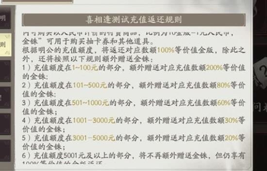 充值返还涉及两种道具:金版和金铢。在三国望神州中,1元人民币对应10个金版,同时也对应10个金铢。金版在正式服中可以当作人民币使用,能够购买月卡、礼包等所有标价人民币的商品,相当于全额返还充值本金。金铢主要用于购买抽卡券和游戏内道具,帮助玩家积累抽卡资源。