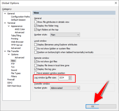 3、然后找到右侧中的"Log window buffer size",对其进行设置,最后点击下方中的"OK"保存即可。