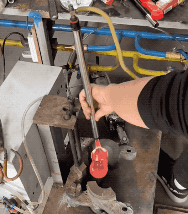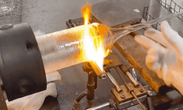 下图是把玻璃烧到半软,一端连着气吹,软塌塌的玻璃被吹鼓起,紧贴着凹凸不平的模具表面,就服帖地做出锤纹效果了。