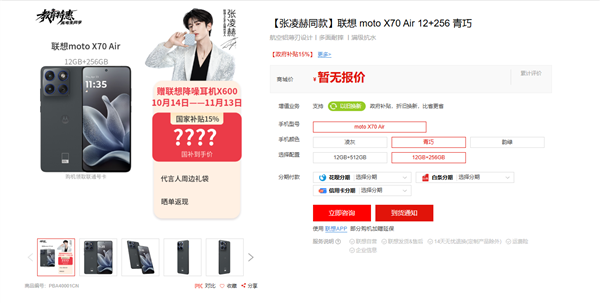据了解,联想moto X70 Air可选凌灰、青巧、韵绿三款配色,提供12GB+256GB、12GB+512GB两种存储版本。