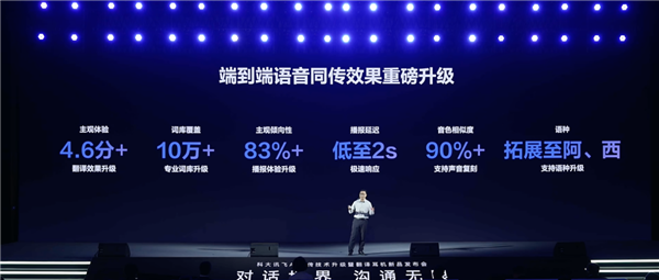 此次技术升级的亮点集中在中英同传效果的持续领跑。新一代技术将翻译的主观体验提升至4.6分(满分5分),有效消除了传统机器翻译的“碎片化”和“机械感”。