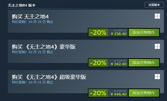 目前,《无主之地4》标准版为238.4元人民币,豪华版为342.4元人民币,超级豪华版为446.4元人民币。