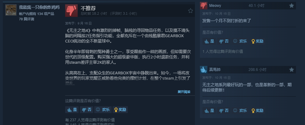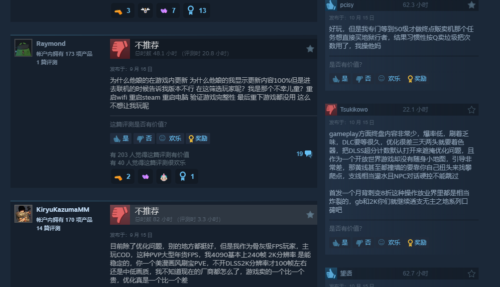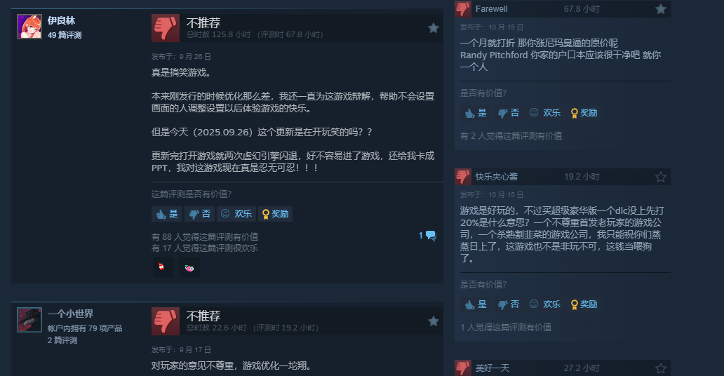 该作全球好评率为61%褒贬不一,国区好评率仅为37%多半差评。差评主要集中在优化差,首发一个月就打折背刺玩家。