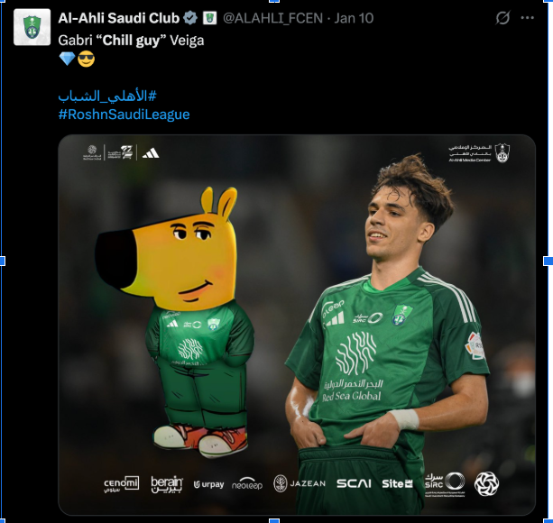 不过,最引人注目的还是足球运动员和球迷。很多球员在进球后对着镜头摆出“Chill Guy”的姿势。一位冉冉升起的超级巨星迪安·胡伊森甚至赢得了“Chill Guy”的绰号。随着他最近转会到世界上最大的俱乐部皇家马德里,众多球迷都开始用“Chill Guy”表情包来欢迎他。