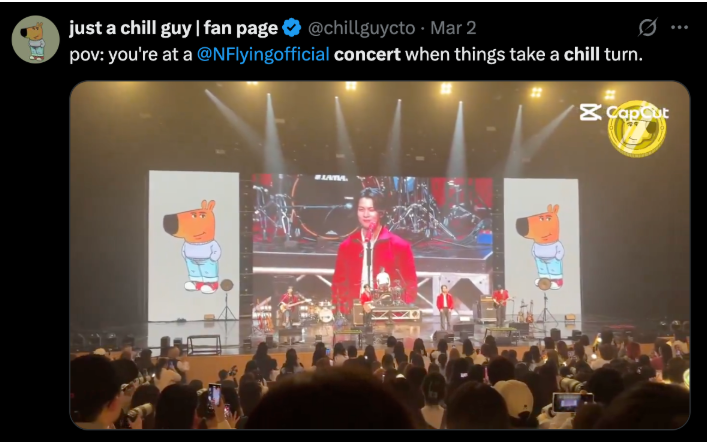 最近,Chill Guy 在韩国、越南等亚洲国家人气飙升。在韩国,很多人都在用这个表情包,或者在现实生活中假扮成 Chill Guy。这支韩国流行乐队甚至在一场演唱会上模仿 Chill Guy 的造型: