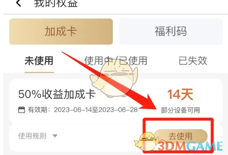2、在“我的权益”窗口点击收益加成卡的“去使用”按钮。