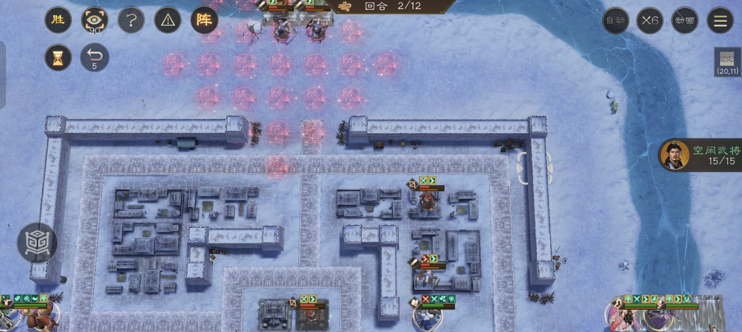 右路几个法师再杀一下,李儒荀彧郭嘉先解决城门口敌人,貂蝉回归郭嘉,曹洪加速郭嘉进城放大打残吕布貂蝉。左路再行动,关羽冲进城里直接技能杀了残血的吕布貂蝉,庞统再杀左边的几个守门敌人。
