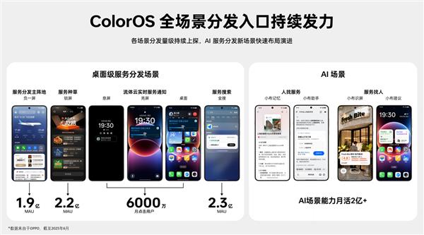 想打车时,手机提前推送常用路线;查航班时,直接看到订票入口……随着 AI 技术深度渗透终端场景,用户对智慧服务的需求已从 “被动获取” 转向“精准匹配、随手可得” 。依托系统级 AI 技术优势与深入用户需求洞察,OPPO已逐步构建起覆盖多场景的智慧服务分发体系,负一屏、小布建议、锁屏、息屏等一系列桌面级服务分发场景和小布助手、小布识屏、小布记忆等AI场景,共同为开发者提供高效、精准的服务曝光与用户连接渠道。截至2025年6月,OPPO 智慧服务覆盖出行、生活、娱乐等多元领域,服务分发量同比增长600%+;分发质量稳步提升,主场景服务分发效率同比提升28%+;分发场景年轻用户渗透同比提升800%+,更有助于开发者触达年轻受众。
