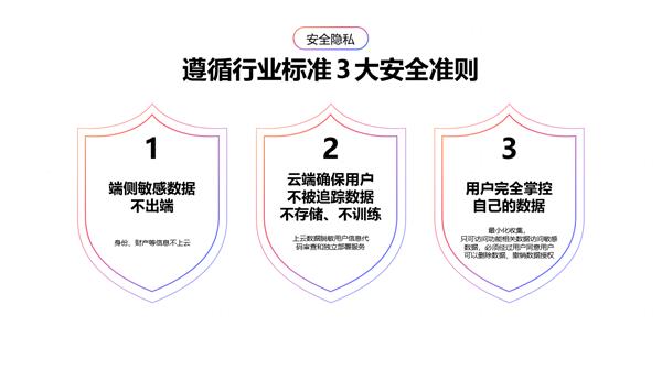 在数据安全方面,遵循行业标准,端侧敏感数据不出端,云端脱敏数据不存储、不参与算法训练,最小化申请用户数据授权,让用户完全掌控自己的数据管理,让开发者服务更值得信赖。