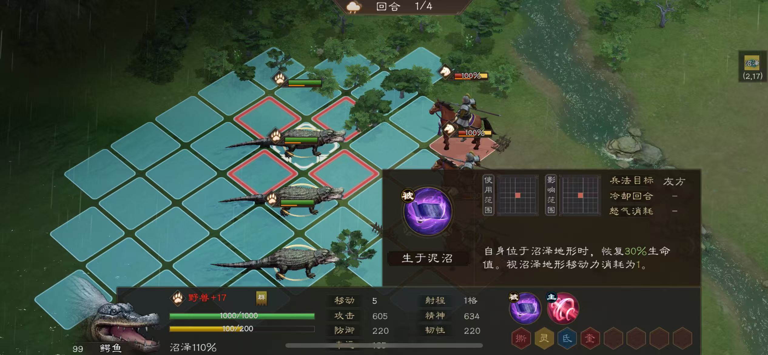 我们可以先看被动属性来确保我们接下来的思路,鳄鱼被动在沼泽可以恢复生命,且在沼泽的加成是110%。那我们的思路就是把敌将拉进沼泽来打。